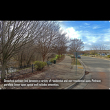 The following images are examples of pathways and public spaces that may be appropriate in mixed use areas. These are organized by interconnected nodes and links. Nodes are often places of respite or of focal activity, and activated with amenities that usually include constructed hardscape or play elements. Links are features such as pathways or linear spaces connecting nodes, usually visibly, and in a meaningful and interrelated context.